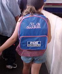 今年は、6月に引越しという大作業があり、球場からはちょっと遠くなってしまったこともあって、今回が球場でのシーズン初観戦。急に思いついてチケットを手配したため、席もそんなによくありませんでしたが、ちょっと蒸し暑いながらも日焼けが気にならない曇り空で、なかなかの野球観戦日和。また、日曜日のデーゲームとあって、観客のほとんどが家族連れ。私たちの前と隣は、どちらもお父さんと息子のふたり連れでしたし、ちょっと前には、3人の娘を連れた家族全員メッツTシャツ着用の家族連れもいたりしました。しかも、今日はプロモーションで、学校が始まった子供たち用のバックパックが配られ、早くも試合帰りには子供たちは皆、これをしょっていました。(写真はこちら)